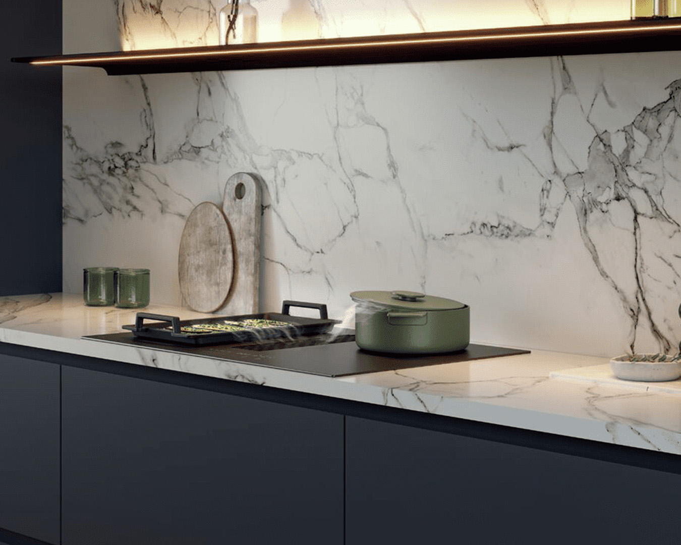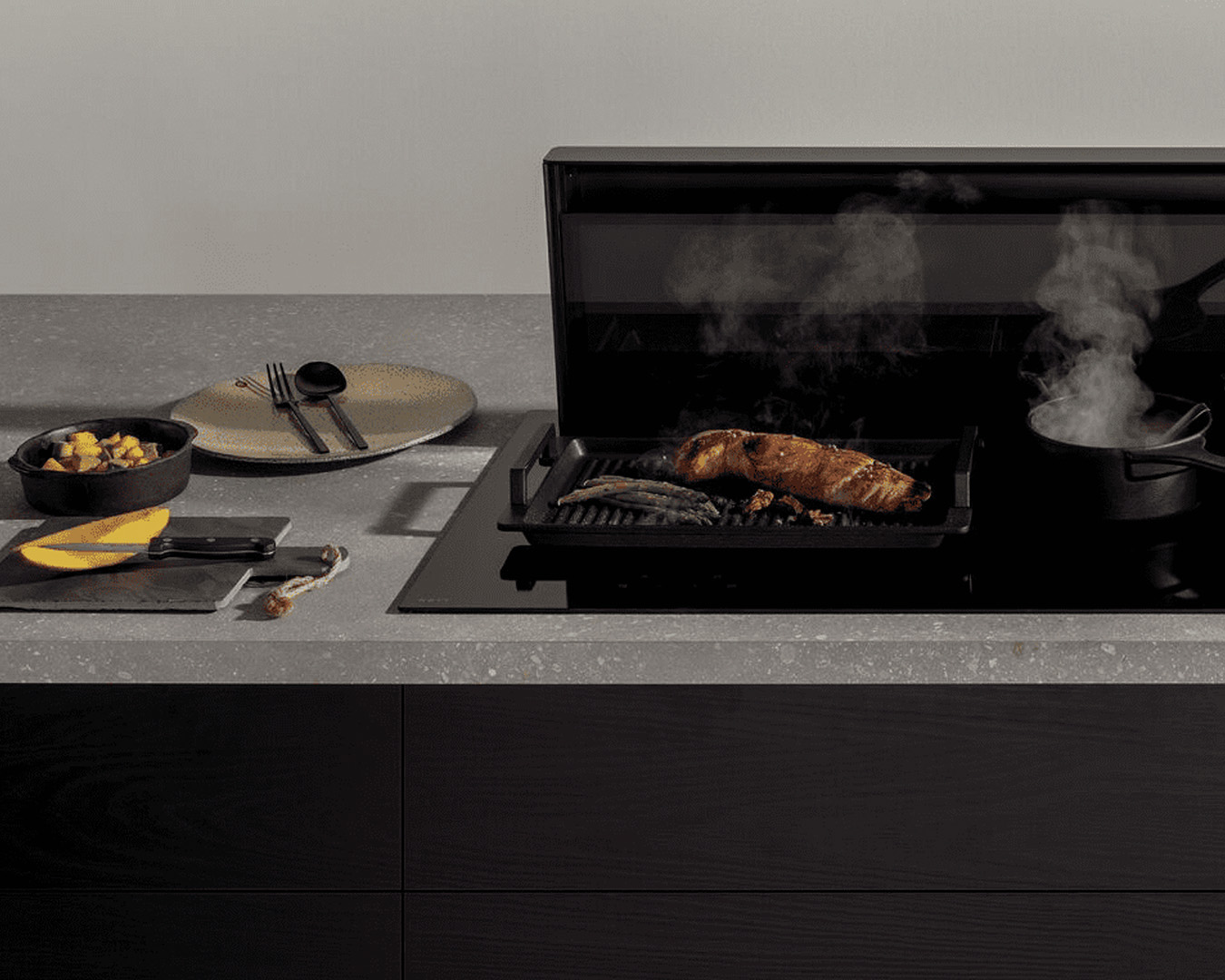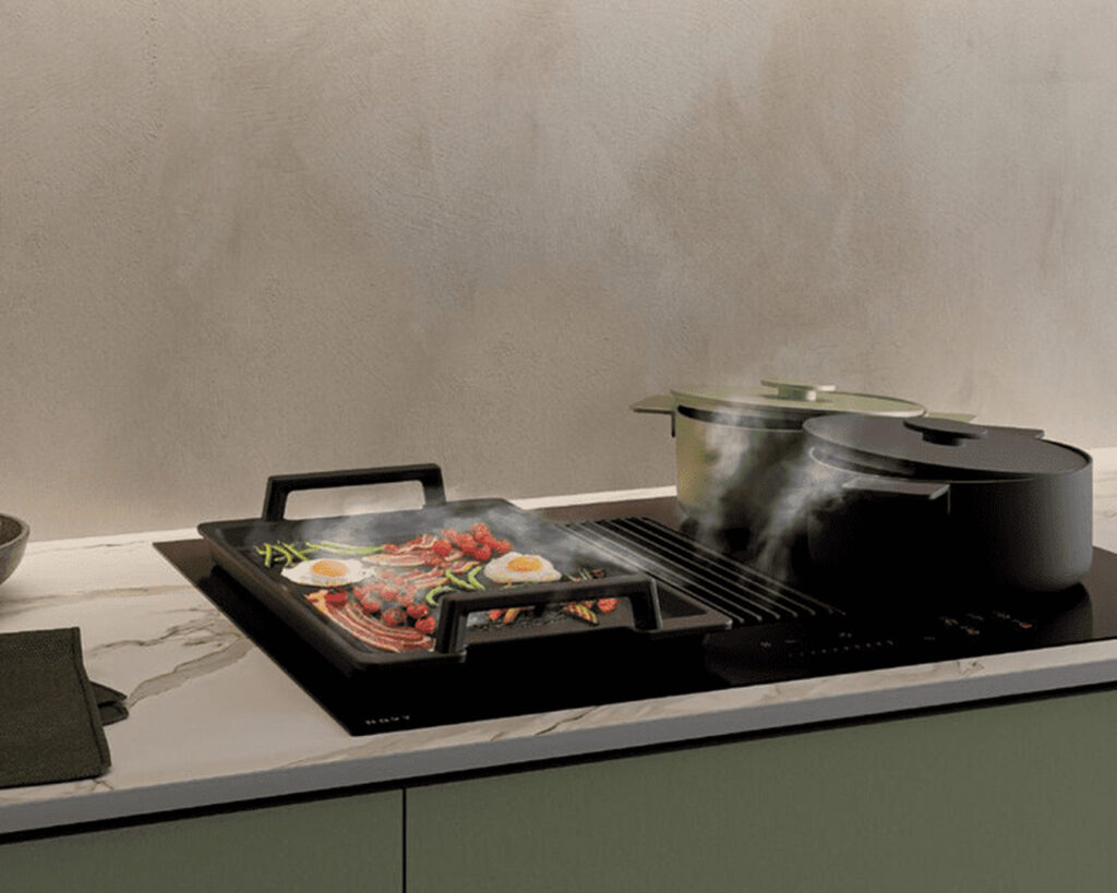 Grillplate til induksjonstopp som fungerer godt sammen med våre benkeventilatorer Panorama 90 og 120, Easy 65 og 80 og Easy Pro, men også på nyheten Undercover.