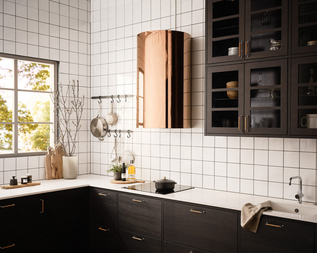 Luna kjøkkenhette er som et smykke på veggen! Denne delikate, populære og allsidige hetten kan leveres i alle farger og metaller – velg det uttrykket som kler deg og ditt kjøkken best. Luna leveres med RørosHetta Sense-teknologien integrert.